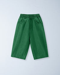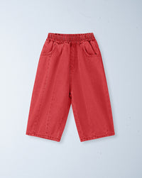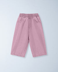 a relaxed wide-leg denim jean, with a soft elastic waist, side and back pockets, and a loose, unrestrictive fit. the drop crotch and longer leg give room to grow — they look super cute with cuffs rolled, and equally perfect worn slightly cropped.